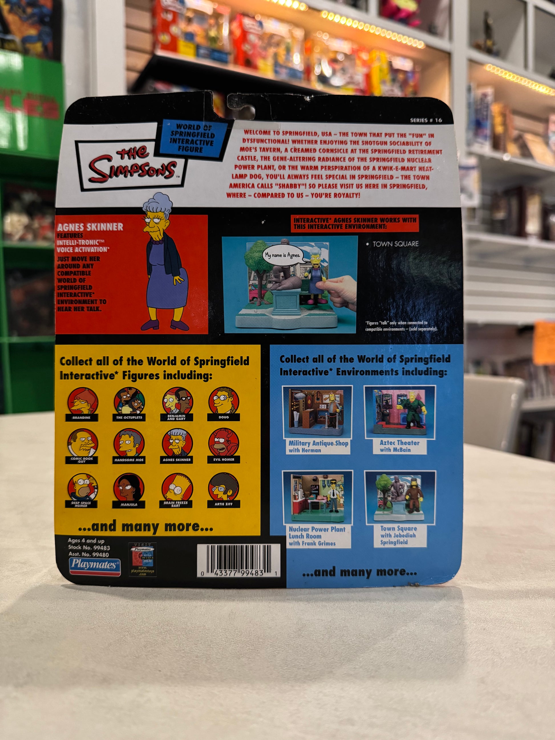 Own a piece of America's cartoon family today! From the 2004 World of Simpsons line. Agnes Skinner, mother of Principal Skinner, is a great addition for any Simpsons completionist! This niche figure interacts with the Town Square environment. See photos for condition.