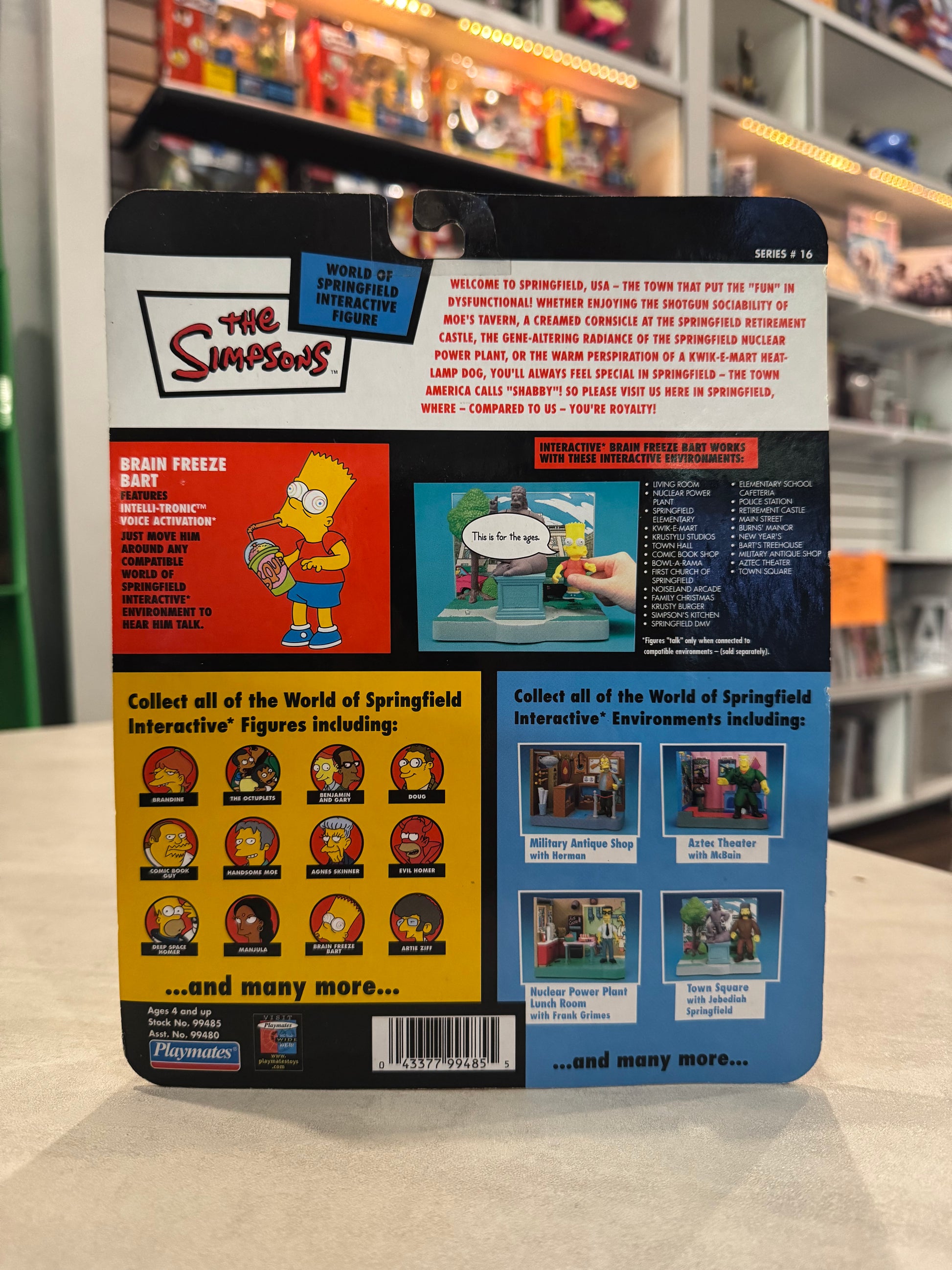 Own a piece of America's favorite family today! From the 2004 World of Simpsons line - Series 16. Brain Freeze Bart Simpson is a classic look for the boy coming straight fro the Kwik-E-Mart with a Squishee. This Bart Simpson figure interacts with so many envrionments including: Town Square, Krusty Burger, Comic Book Shop and so many more. See photos for condition.