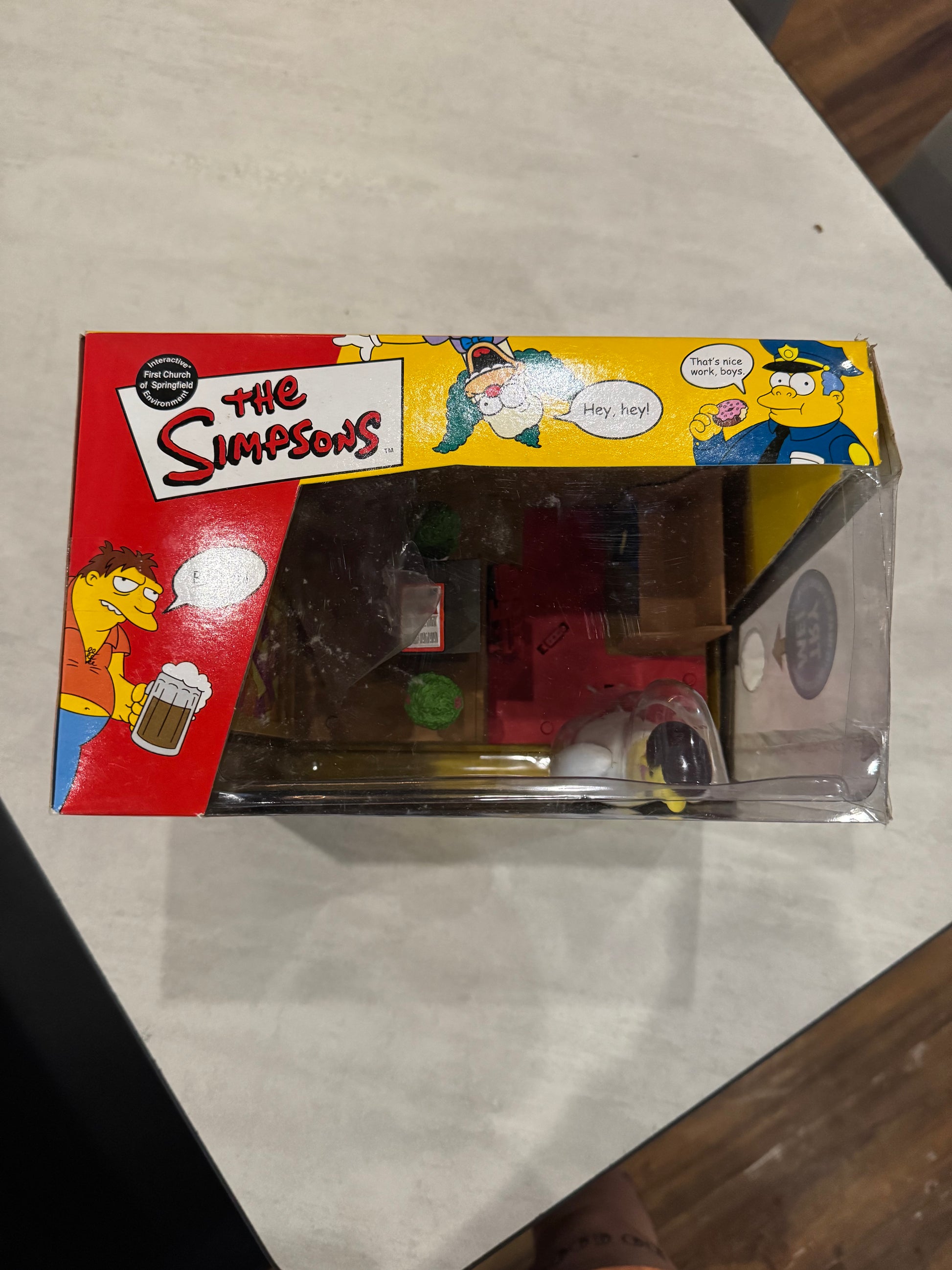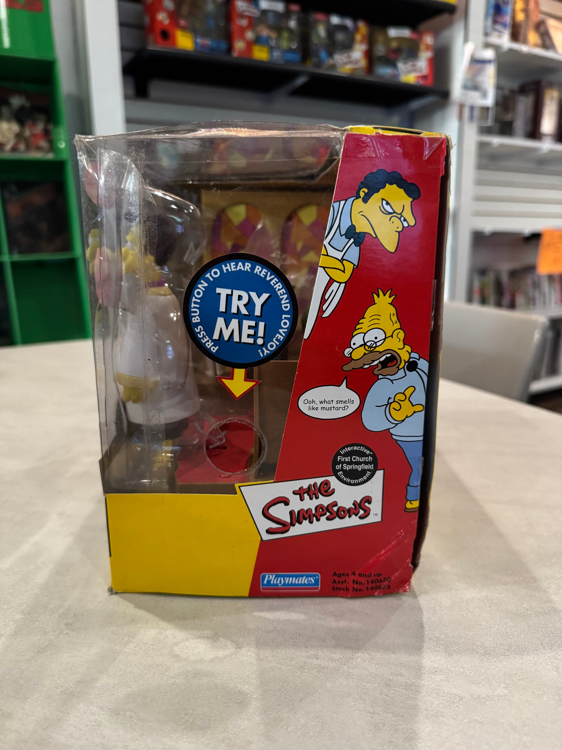 Own a piece of America's favorite family today! From the 2001 World of Simpsons line. Exclusive Reverend Lovejoy figure is part of the First Church of Springfield interactive playset! This piece interacts with over 30 figures from the World of Simpsons line of figures. In box, see photos for a better look at condition.